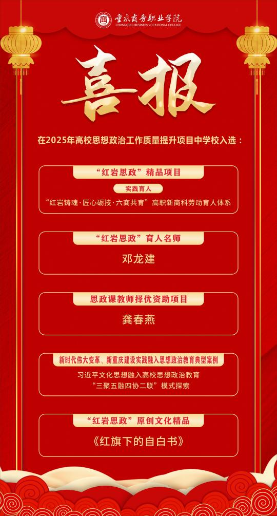 【文/图 党委宣传部(统战部)】近日,重庆市教育委员会公布2025年高校思想政治工作质量提升项目入选名单。按申报要求,经专家评审、网上公示等程序,学校共有5个项目入选。《“红岩铸魂·匠心砺技·六商共育”高职新商科劳动育人体系》入选“红岩思政”精品项目(共20个);邓龙建入选“红岩思政”育人名师(共10名);龚春燕入选思政课教师择优资助项目(共15项);《习近平文化思想融入高校思想政治教育“三聚五融四协二联”模式》入选探索新时代伟大变革、新重庆建设实践融入思想政治教育典型案例(共15项);《红旗下的自白书》入选“红岩思政”原创文化精品(20项)。