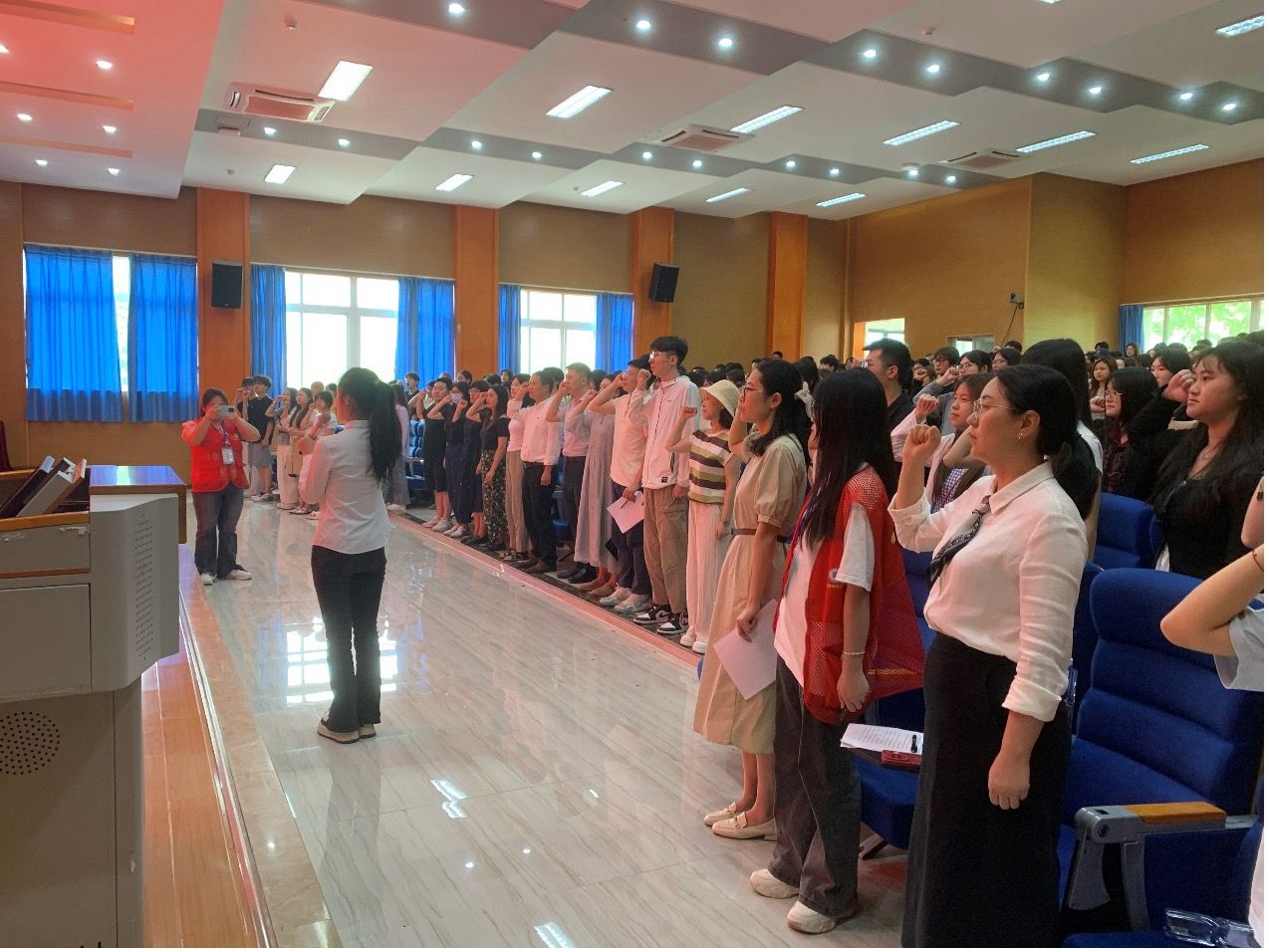 学生成长中心主任对本次大学生心理健康月的系列活动进行了推介,阳光心理协会学生代表喻诗然带领全体师生庄严宣誓。