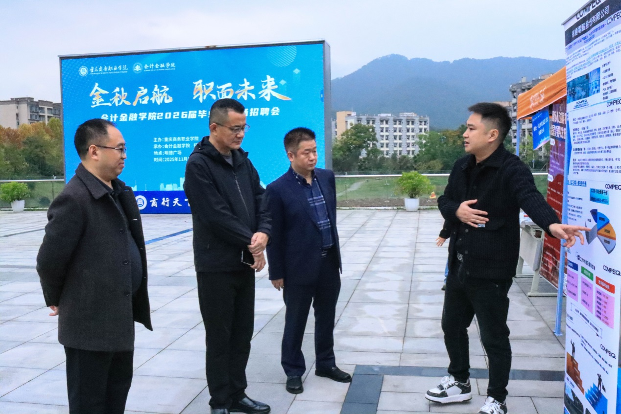 【文/图 会计金融学院】为精准赋能2026届毕业生高质量就业,2025年11月12日,重庆商务职业学院会计金融学院精心筹备的“金秋启航 职面未来”专场招聘会在明德广场顺利举行。作为学院深化“招生—培养—就业”一体化改革的关键举措,本次招聘会精准链接校企资源,为毕业生搭建了高效便捷的供需对接桥梁。