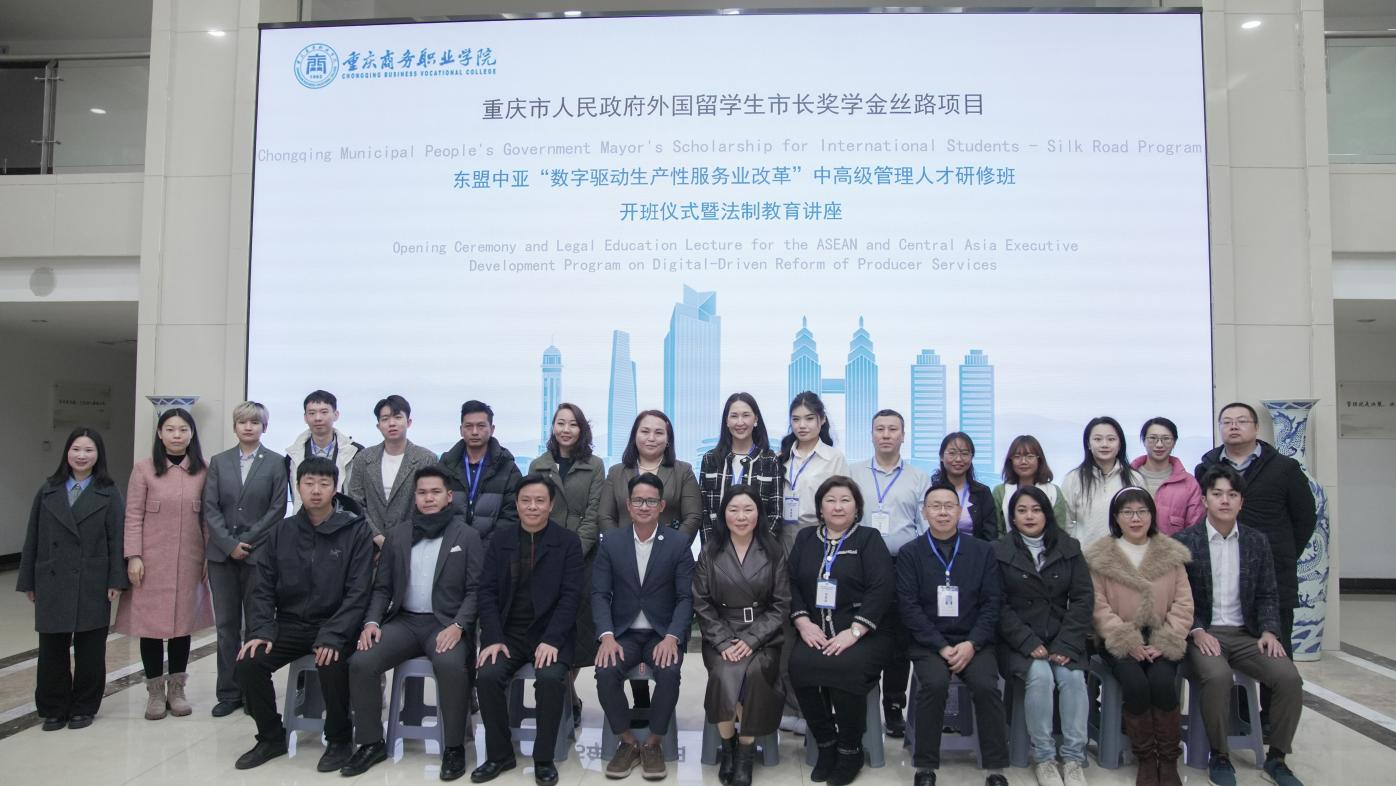 【文/对外合作交流中心 图/党委宣传部】2025年12月24日上午,重庆市人民政府外国留学生市长奖学金丝路项目——东盟中亚“数字驱动生产性服务业改革”中高级管理人才研修班开班仪式暨法制教育讲座在重庆商务职业学院顺利举行。来自文莱、柬埔寨、马来西亚、缅甸、泰国等东盟国家,以及哈萨克斯坦等中亚国家的政府、行业及院校的20余名中高级管理人才与专家学者齐聚山城。沙坪坝区公安分局丰文派出所民警,合作企业代表,学校党委副书记余晓玲及对外合作交流中心、党委保卫部、现代商贸学院、通识教育学院(国际学院)等相关部门负责人出席本次活动。