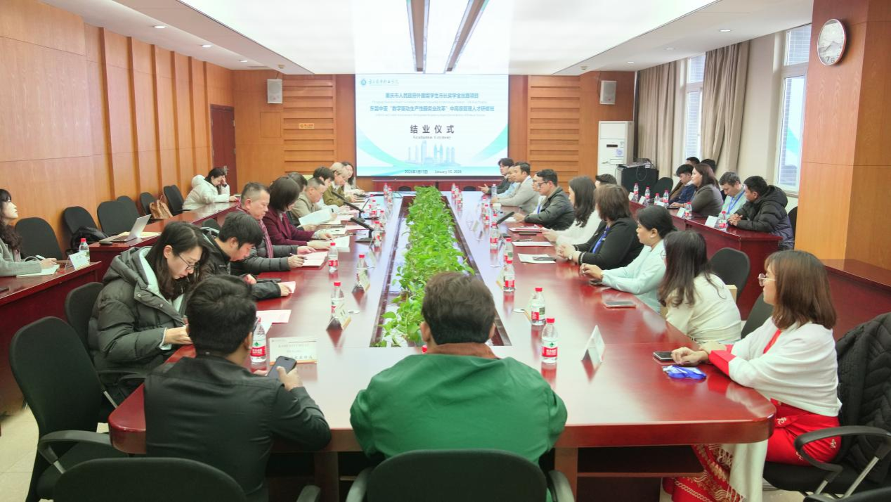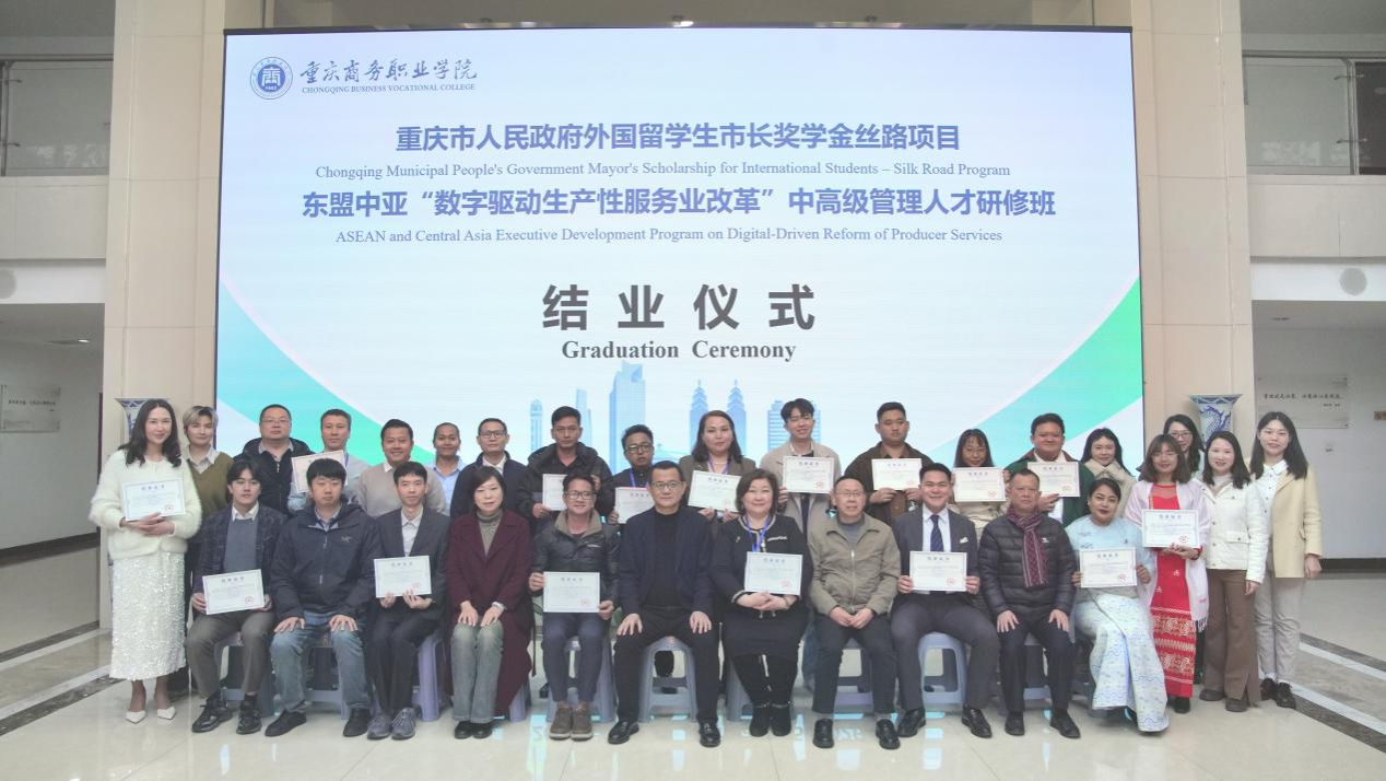 【文/对外合作交流中心 图/党委宣传部】1月15日下午,重庆市人民政府市长奖学金丝路项目——东盟中亚“数字驱动生产性服务业改革”中高级管理人才研修班结业仪式在学校办公楼第三会议室顺利举行。来自文莱、柬埔寨、马来西亚、缅甸、泰国、哈萨克斯坦等6国的21名政府部门官员、企业高管及院校学者圆满完成为期近一个月的研修任务。项目聚焦数字经济前沿,系统展示了中国在数字化领域的创新实践。