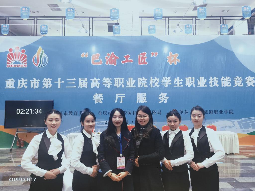 餐厅服务赛项包含西餐宴会摆台、西餐英语服务、咖啡制作、葡萄酒品鉴、烈性酒品鉴、鸡尾酒制作等六个分赛项,经过两天的激烈角逐,学校代表队传恩敏同学获得一等奖(指导教师:梁海兰),杨春雪、王玉婷同学获得二等奖(指导教师:梁海兰周璐),白雪同学获得三等奖(指导教师:吕峥),梁海兰老师获重庆市优秀指导教师称号。