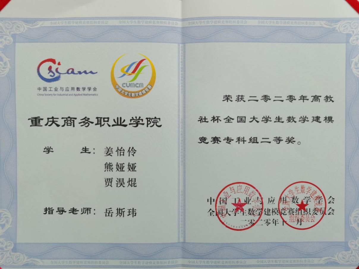 【文/图 公共管理系】近日,全国大学生数学建模组委会公布2020年全国大学生数学建模竞赛获奖名单。学校姜怡伶、熊娅娅、贾淏焜组成的大学生参赛团队获专科组全国二等奖,指导教师岳斯玮被重庆市教育委员会评为“优秀指导教师”。学校连续5年在该项竞赛中均获得全国奖,在同类高校中名列前茅。