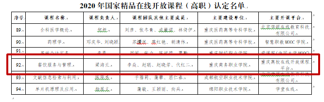 【文/图 教务处】近日,教育部公布了2020年国家级精品在线开放课程(高职)认定结果,学校餐饮旅游学院梁海兰老师主持的《餐饮服务与管理》精品在线开放课程在激烈的竞争中脱颖而出,实现了学校国家级精品在线开放课程零的突破。
