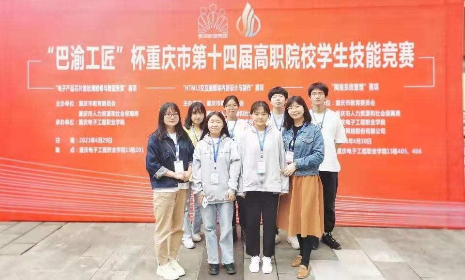 【文/图 出版传媒系】近日,“巴渝工匠”杯重庆市第十四届高等职业院校学生职业技能竞赛“HTML5交互融媒体内容设计与制作”赛项在重庆电子工程职业学院举行,来自重庆市内15所高职院校的29支队伍同台竞技。由出版传媒系教师刘晓庆、吴迪、美和易思校企共建专业教师詹芝明共同指导的两支队伍获二等奖和三等奖。