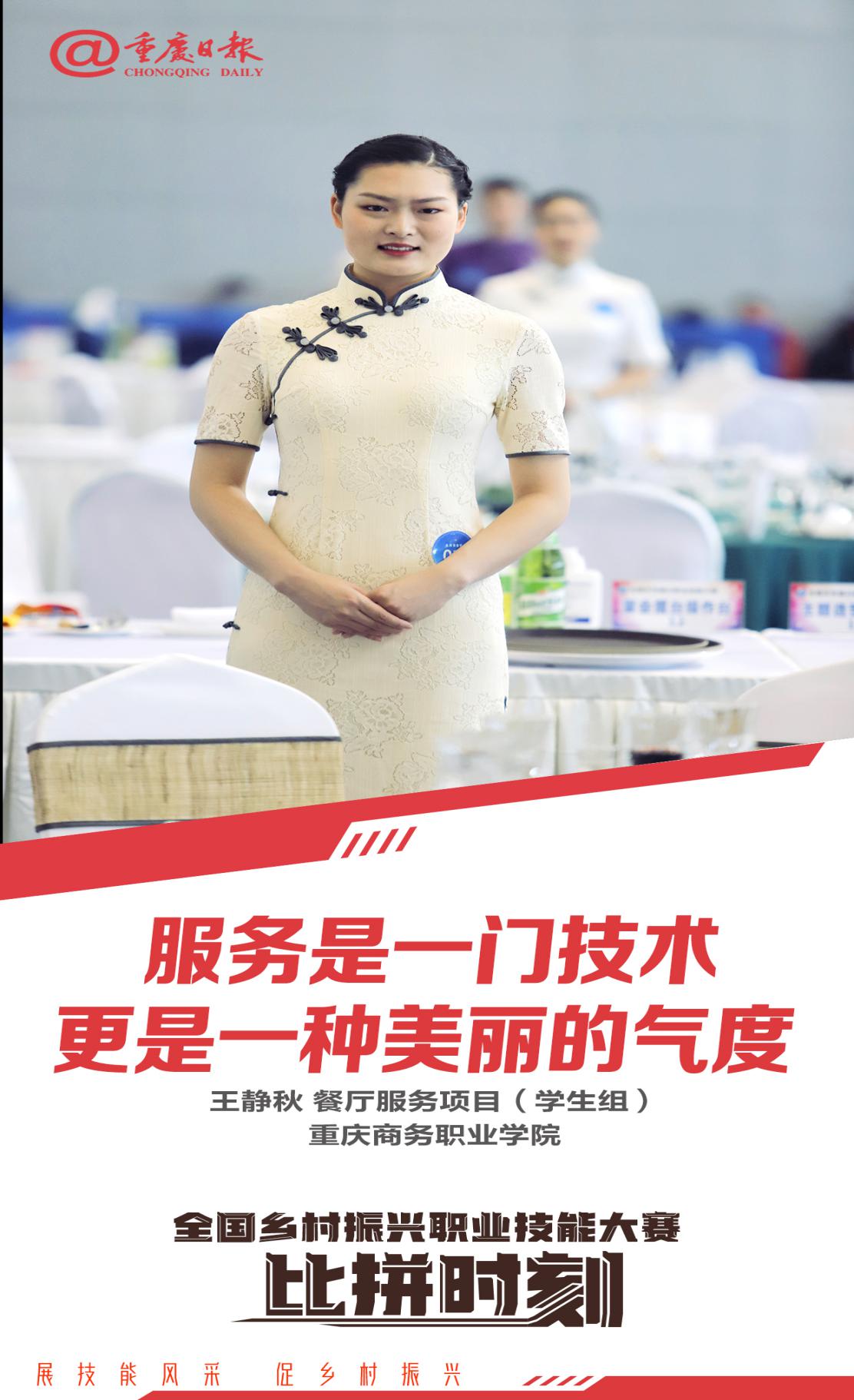 王静秋的摆台主题是“遇见夏布”,无论是她身穿的“薄如宣纸、清如蝉翼”的旗袍,还是大大小小的台面摆件、椅围,都运用到了重庆市荣昌区的国家级非物质文化遗产——夏布。台面设计紧扣乡村振兴主题、独具特色,加上选手优雅大方的摆台技能赢得评委和观众高度赞扬,最终脱颖而出,获得餐厅服务项目(学生组)金奖。