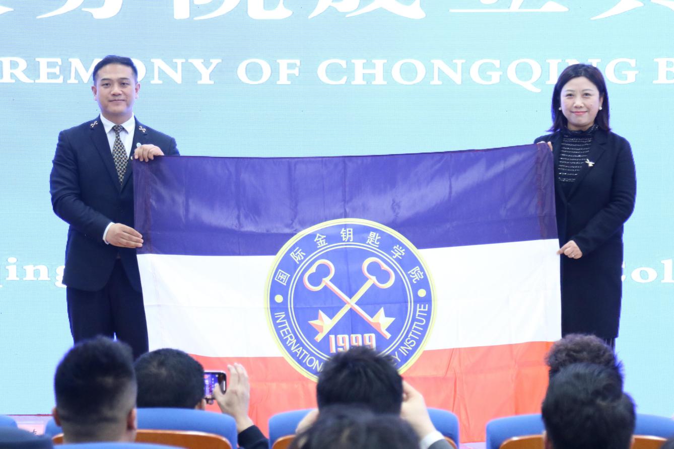国际金钥匙学院重庆分院是该学院在重庆地区授权设立的第一家地区中心分院。典礼上,张勇代表国际金钥匙学院为重庆分院颁发证书、标识并授牌、授旗,授予文化旅游学院院长赵晓芳为国际金钥匙学院荣誉董事、宣布文化旅游学院党总支书记莫灼宇为重庆分院院长,为校内导师授徽、校外客座讲师颁发聘书。重庆分院第一期21级金钥匙班同学们参加拜师、授章仪式及宣誓。