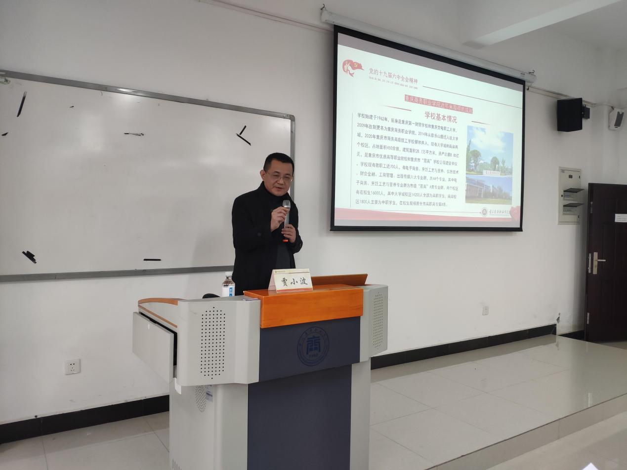贾小波围绕深刻认识总结党的百年奋斗重大成就和历史经验的重大意义、深刻认识党的百年奋斗的初心使命和重大成就、深刻认识中国特色社会主义新时代的历史性成就和历史性变革等六个方面深入解读了党的十九届六中全会召开的重大意义、重大成果和全会提出的“两个确立”“十个坚持”和“伟大号召”。贾小波结合学校发展实际向大家展示了学校近五年来取得的成就和变革,希望大家在党的十九届六中全会精神指引下深学细悟笃行,将会议精神落实到日常工作中,在平凡的工作岗位中坚守初心、使命,为学校双高建设、内涵发展增砖添瓦。