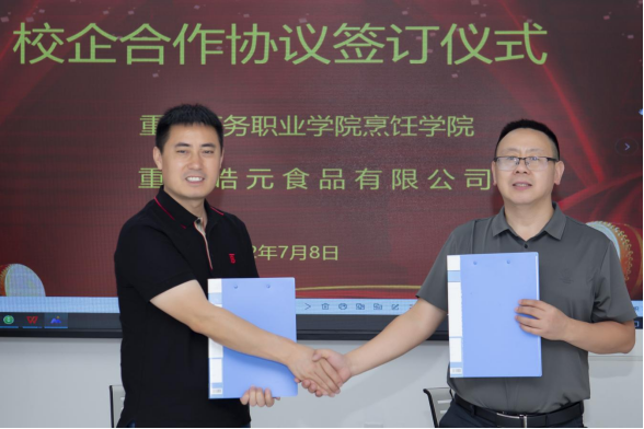烹饪学院与重庆皓元食品有限公司签订校企合作框架协议,并授牌重庆皓元食品有限公司为“重庆商务职业学院烹饪学院实践育人基地”。