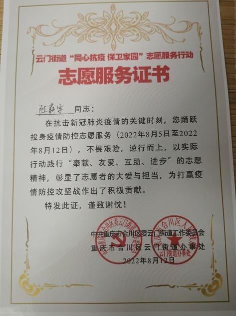 8月8日晚,合川区团区委青年突击队紧急招募志愿者赶赴云门街道进行支援,陈薪宇第三次主动报名,在云门街道坚守四天三夜。最终,青年突击队光荣完成任务,陈薪宇得到了团区委和云门街道的一致肯定,该生三次主动参与社区抗疫,展现了青年一代党员志愿者的担当和道德模范的榜样力量。