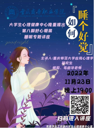 【文/图 学生工作部】11月23日,学校大学生心理健康中心特举办睡眠主题线上讲座,围绕如何睡个好觉与同学们作相关分享。本次讲座邀请了重庆师范大学心理学专业研究生姚莉、毛启华老师为同学们分享睡眠相关的知识,帮助同学们理性看待失眠问题。