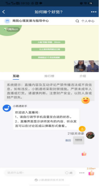本期讲座得到同学们的积极反馈,不少同学通过评论和在线连麦与老师讨论了自己关于失眠方面的困扰,也表示通过此次讲座使自己对于睡眠有了新的认识,会在之后进行自我调节以改善睡眠质量。
