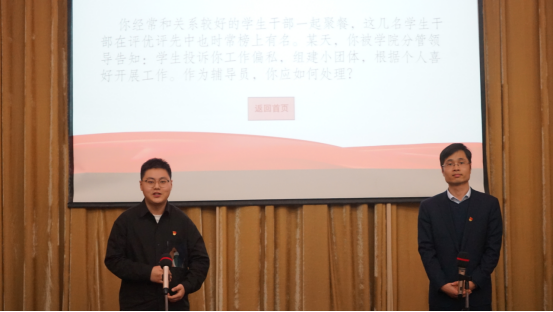 本次比赛进行了理论考察和技能测试,理论考察重点围绕习近平总书记关于教育的重要论述精神以及《普通高等学校辅导员队伍建设规定》(教育部令第43号)具体职能职责,主要考察辅导员的政治理论和业务理论情况。