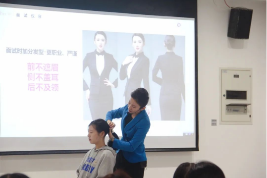 活动中,国家人才网高级礼仪培训师涂宝予为在校女大学生们宣讲就业政策、培训面试礼仪,她用丰富的知识、优雅的谈吐和鲜活的实例分别从仪容仪表、面试礼仪、职场穿搭等几个方面带领同学们了解了相关礼仪知识,并通过互动演示,把礼仪知识从“讲解”带到“实操”,为参加培训的同学们上了一堂生动实用的面试礼仪课,帮助同学们学会运用礼仪规范,在求职中提升竞争力。