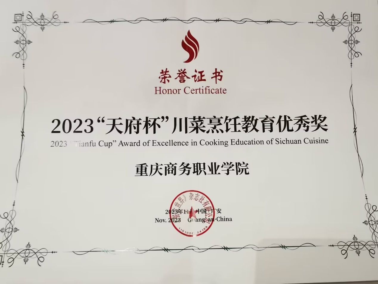 大会为川菜发展作出贡献的行业企业及院校单位颁发了“2023‘天府杯’世界川菜传播奖”“2023‘天府杯’川菜烹饪教育优秀奖”,重庆商务职业学院荣获“2023‘天府杯’川菜烹饪教育优秀奖”。