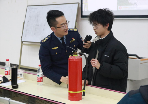 主讲人胡云波教官强调了火灾无情,预防先行的重要性。他结合近年来发生的火灾案例,向大家详细分析高校校园火灾的起因及存在的隐患,通过一问一答的方式,让师生们深入思考火灾来临时的应对方法,邀请学生现场“零距离”体验使用灭火器,讲解如何正确地使用灭火器以及消防栓。