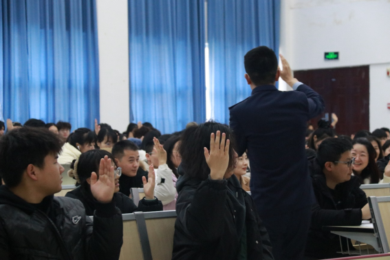 胡云波强调,校园寝室是极易引发火灾的场所,在校园中要做到不乱扔烟头,在寝室里要避免使用大功率电器,定期检查电器线路,避免线路老化引发火灾。手机、烧水壶、电吹风等设备的充电或使用后要及时拔掉电源,以免造成电池过热引发火灾。他对在座的师生进行提问和解答,告诉大家如果被困在火场中,不要盲目逃生而要保持冷静等待救援人员,应尽量找到一个安全的避难场所,向外发出求救信号,用湿毛巾捂住口鼻避免吸入有毒烟雾。如遇较高楼层且火势很大的情况下,应及时封锁门窗并用湿毛巾堵住门窗缝隙处,以防浓烟灌入屋内。