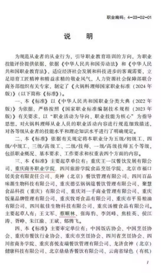 【文/图 烹饪学院、继续教育学院】近日,人力资源和社会保障部办公厅、商务部办公厅联合颁布了中式烹调师(火锅料理师)国家职业标准,学校作为第二排名主要起草单位,烹饪学院、继续教育学院、渝菜烹饪研究院蔡顺林作为第二排名人参与本标准制定。这是学校首次参与国家职业标准制定,实现了在制定国家标准成果上的零突破。