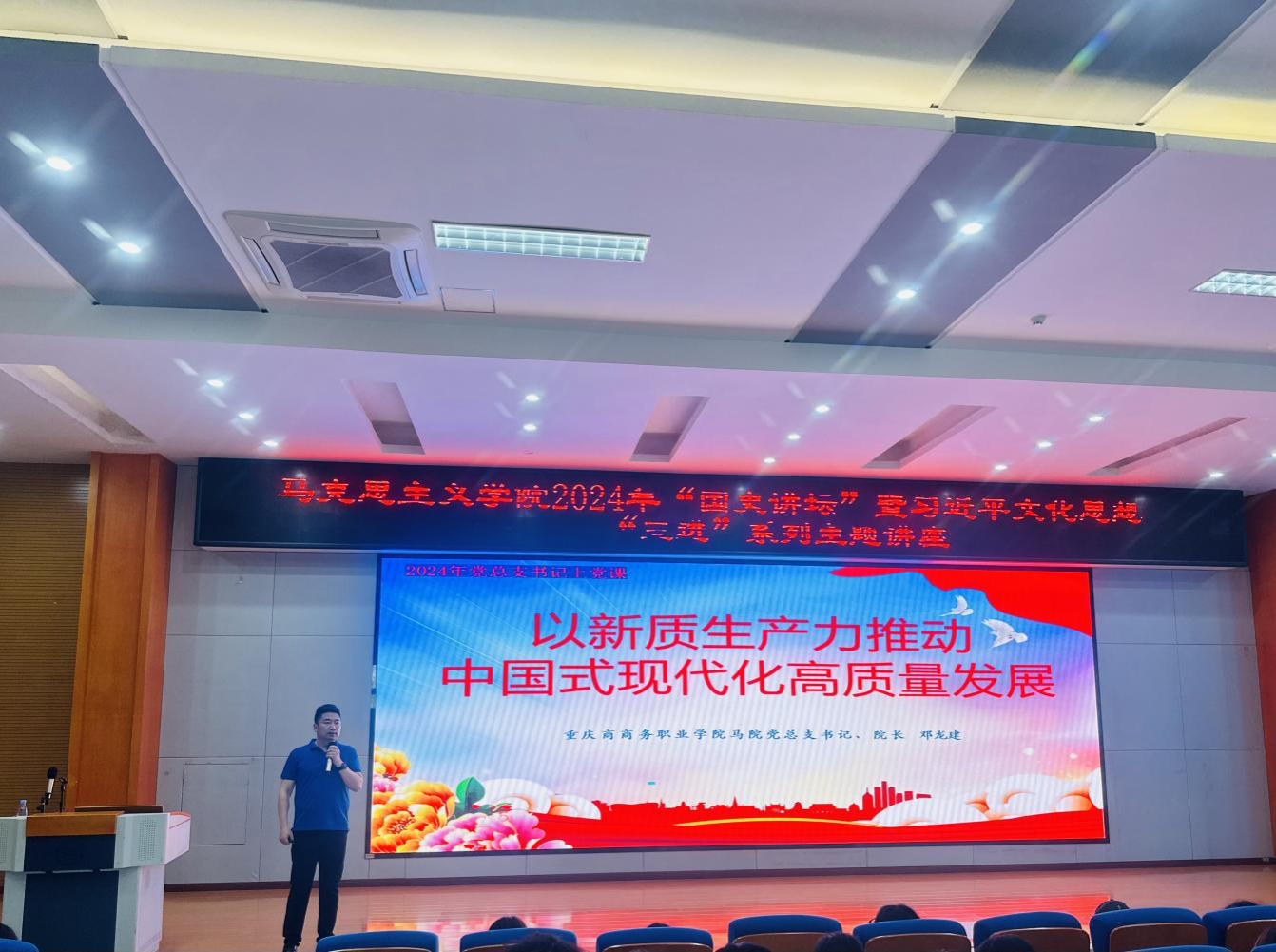 邓龙建以《新质生产力推动中国式现代化高质量发展》为题,深刻解读了什么是新质生产力、发展新质生产力的核心要素、如何发展新质生产力等主要内容,对大学生在新时代服务发展新质生产力的角色与使命给予了中肯建议,引发了学生们的共鸣与思考。杜微老师以《中国人文地理》为题,探讨了空间与文化的关系,阐述了不同地理环境对地域文化的塑造作用。她强调了理解、认识与尊重文化的重要性,呼吁学生们积极参与并推动中国文化的繁荣发展与创新。