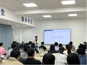 潘庆结合实际案例,从“点亮思想之光 做学生思想的引路人”“推开就业之窗 做学生就业的热心人”“夯实育人之基 做学生成长的知心人”3方面,围绕切实抓好学生党建工作,做好学生思想引领,促进学生全面发展,加强学生就业,与全体辅导员进行了深入交流。