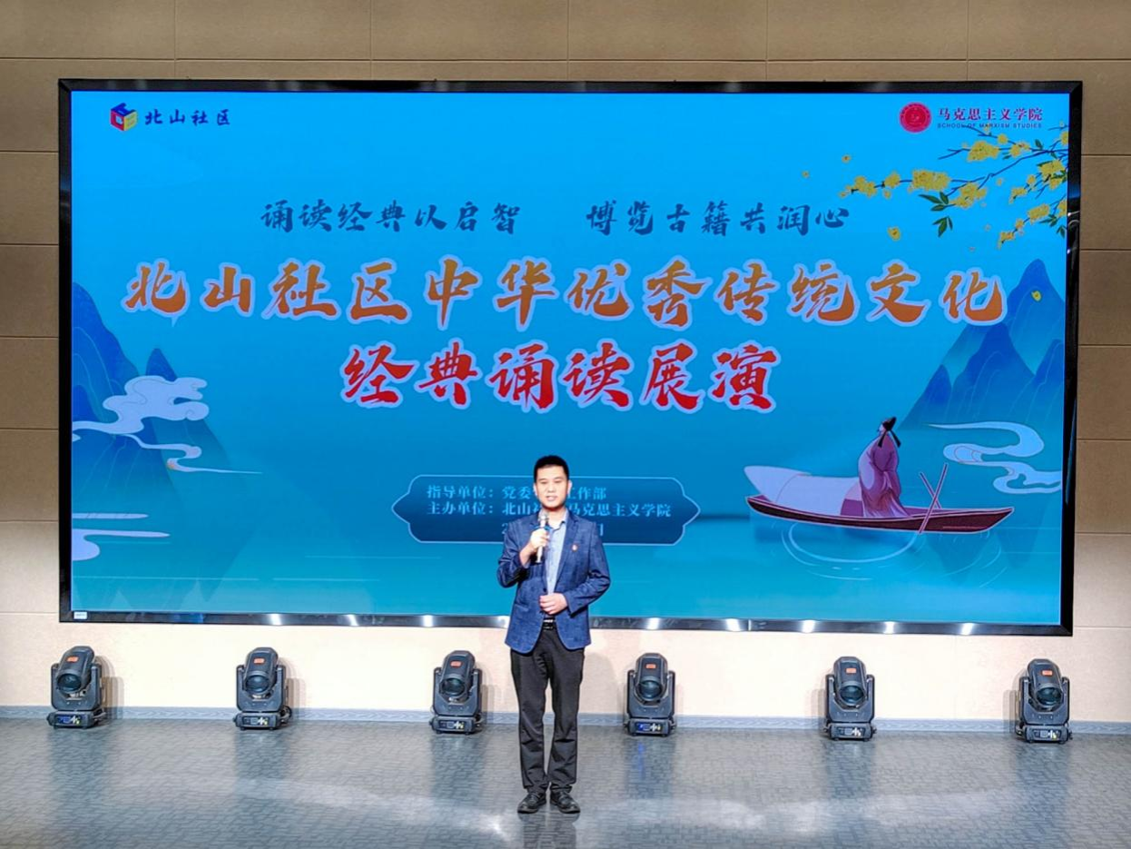 活动伊始,北山社区党支部书记对本次活动致辞。他表示此次活动发挥了马克思主义学院思政课程主渠道、主阵地作用,让学生社区各类活动的“血”与“肉”有了“根”和“魂”,希望同学们通过欣赏本次经典诵读展演能够有所感悟及收获,继续热爱、传承和发扬中华优秀传统文化。