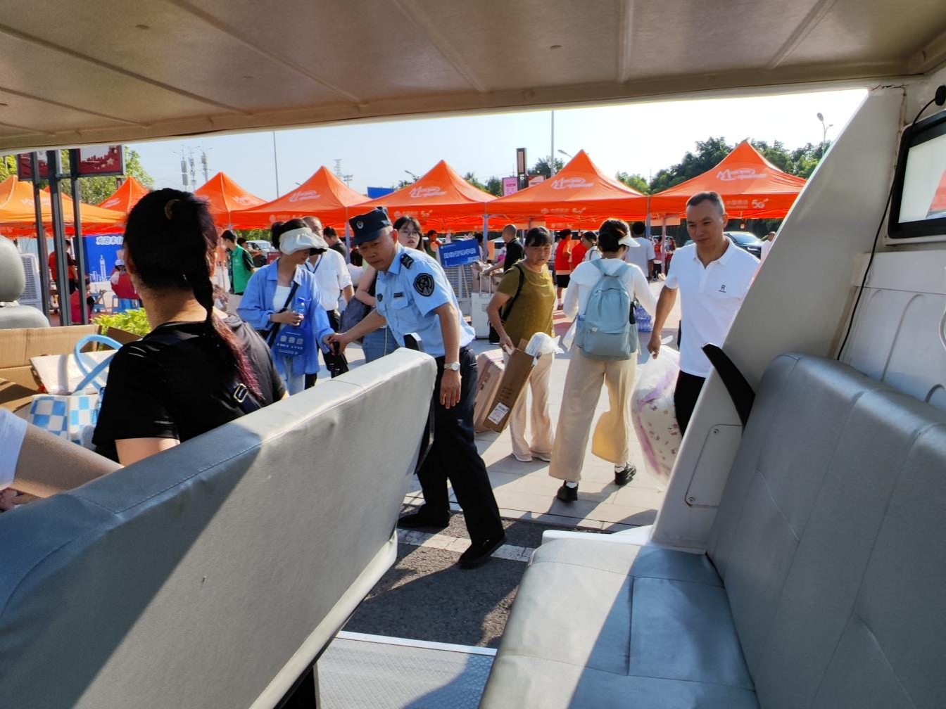 迎新期间,党委保卫部全体人员克服高温炎热坚守岗位,多措并举全力维护校园交通秩序。邀请了辖区交警鼎力支援;按照“平安、有序、顺畅”工作原则,在校大门引导送新车辆放下行李后即停即走,停放在指定停车区域;党委保卫部工作人员同物业安保人员在一线指挥交通,避免出现车辆拥堵;联合交通运输执法人员现场对报到新生进行普法宣传,教育学生不乘坐非法营运车辆。
