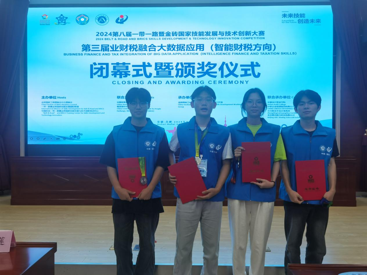 学校会计学院大数据与会计专业学生张宗宇、吴海军、杨珺颢,大数据与财务管理专业学生程兴旺组成的参赛队在教师罗玦、文琴的指导下取得第11名的好成绩,荣获该赛项学生组二等奖。罗玦、文琴荣获优秀指导教师。