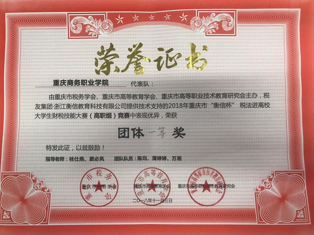 2018年 11月3日,由重庆市税务学会、重庆市高等教育学会、重庆市高等职业技术教育研究会联合主办,税友集团浙江衡信教育科技有限公司提供技术支持的2018年重庆市“衡信杯”税法进高校大学生财税技能大赛在重庆工商大学举行。代表学校参赛的两支代表队备赛方案科学,赛前积极训练,在43支高职组参赛队伍中,双双荣获团体一等奖,取得了参加该项比赛以来的历史最好成绩。
