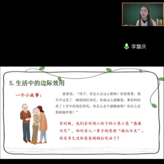 李馥庆老师通过对经济学理论、消费者效用、边际效用递减规律等知识的讲解,引出生活中与父母相处边际效用的案例,提高学生的生活满足感,引导学生要知恩感恩,孝敬父母,发扬中华民族传统美德。