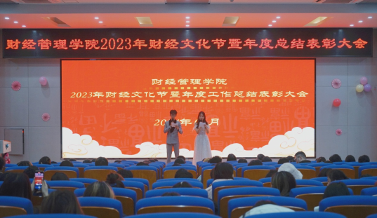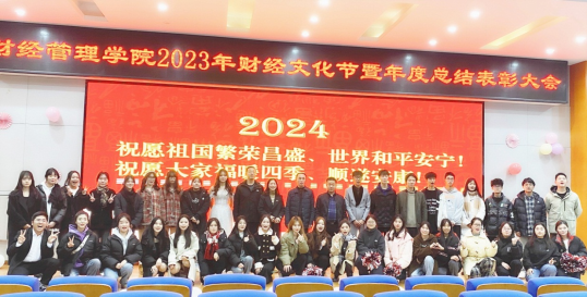 1月5日下午,学院在二教报告厅召开财经文化节暨2023年度工作总结表彰大会,全体教职工和学生代表共计200余师生参加。大会在《相亲相爱》的歌声中拉开帷幕。