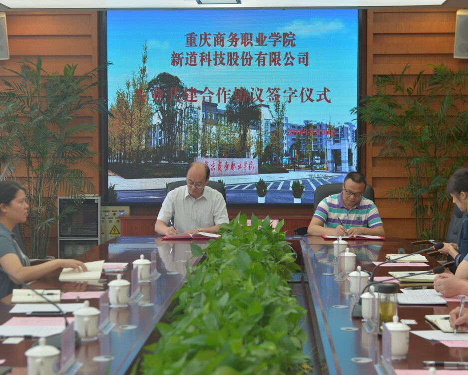 新道科技股份有限公司副总裁宋健高度赞赏学校近年来取得的不凡成就,希望双方以签署“云财务会计师专业共建协议”为起点,在商科综合育人实践,创新创业,师资研修等方面深度合作,协同育人。新道公司将全力支持我校的优质校建设,打造新亮点,实现新突破。最后丁谦副院长与宋健副总裁签署了专业共建协议书。