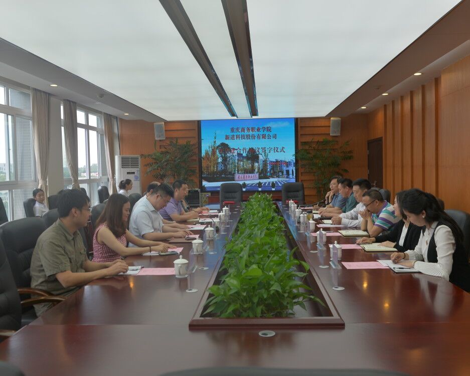 院长冉光学对新道科技股份有限公司副总裁宋健、重庆分公司总经理师唯伟等一行的到来表示热烈欢迎,介绍了学校的专业设置、师资队伍、招生就业等基本情况,希望双方进一步深化产教融合,共同发展,共同进步,共同成长。