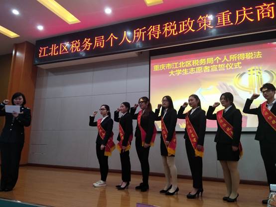 活动包括税法学堂、知识竞赛和志愿者宣誓等三项内容。重庆市江北区税务局所得税科秦文武老师、纳税服务科科长王璐对《新个人所得税条例》以及专项扣办法除等其他配套法律文件对进行了解读。我院17级12名学生组成的6支参赛队进行的一场激烈而精彩的税法知识竞赛,比赛环节精彩纷呈,评出一等奖一名,二等奖两名,三等奖三名。最后,江北区税务局工作人员与我院纳税志愿者一起进行了宣誓。