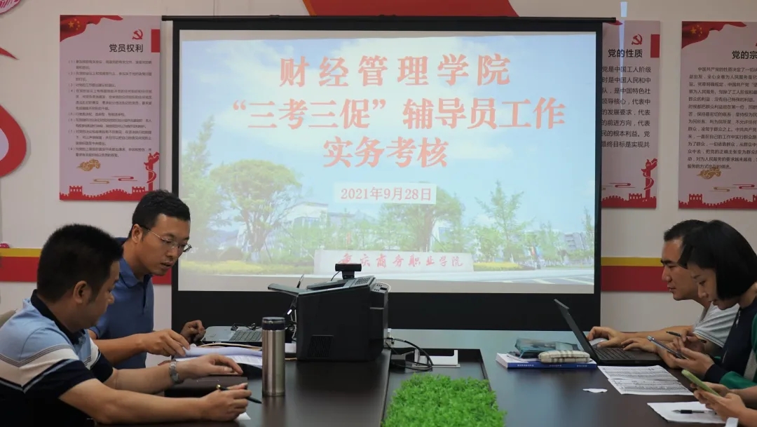 9月28日,财经管理学院在2401党建工作室开展“三考三促”辅导员工作实务考核,学院党总支书记、院长苏启立、党总支副书记阳春艳、副院长张建出席并作为评委进行现场提问打分,全体2019级辅导员接受实务考核。