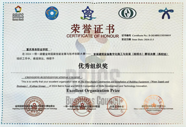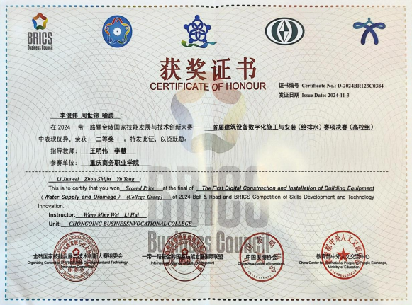 11月1日—3日,2024“一带一路”暨金砖国家技能发展与技术创新大赛首届建筑设备数字化施工与安装(给排水)赛项全国总决赛在浙江建设职业技术学院隆重举行,来自全国高校的128支队伍参加了大赛。