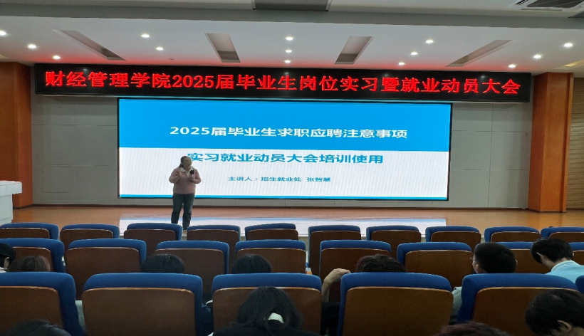 11月7日,财经管理学院在学术报告厅召开2025届毕业生岗位实习暨就业动员大会,学院领导、各办公室(教研室)主任、全体岗位实习指导教师、毕业生辅导员、2025届毕业生代表共200余人参加。会议由副院长张建主持。