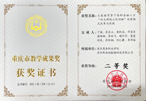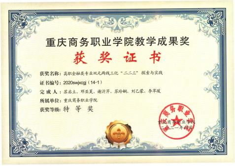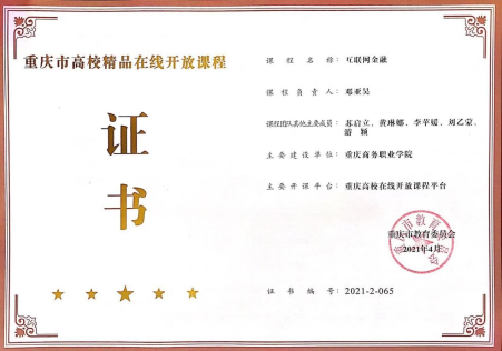 组建团队,争创一流。财经管理学院将课程建设作为提高教学质量的核心要素,2019年6月组建课程团队,零起点起步,高标准建设《互联网金融》在线课程,校企合作开发共建互联网金融数字资源,积极探索“岗课赛证”综合育人机制,2020年认定为重庆市高校线上一流课程(精品在线开放课程),助力金融专业2021年获得校级教学成果特等奖、重庆市教学成果二等奖。