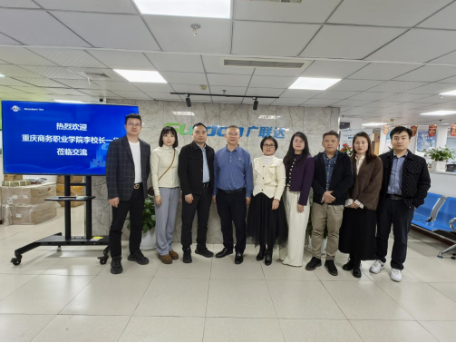 在广联达科技股份有限公司重庆分公司,教育事业部李明阳总经理介绍了公司的发展历程、核心技术产品以及在行业内的应用案例。校企双方围绕校企合作、AI赋能人才培养、城市更新等方面进行了深入交流。