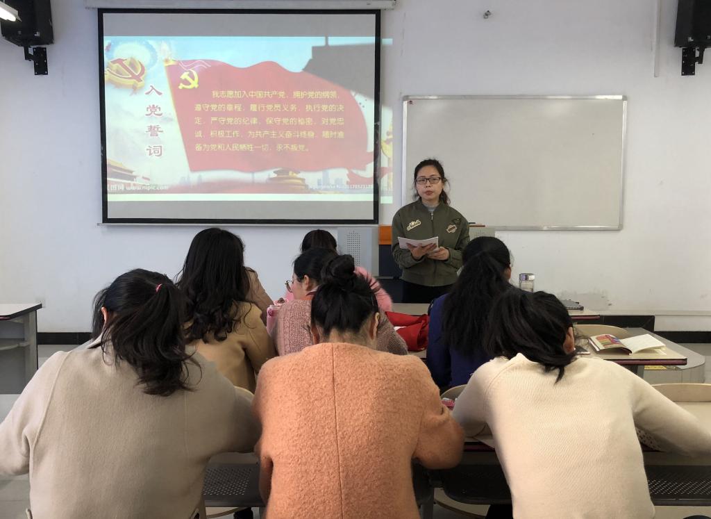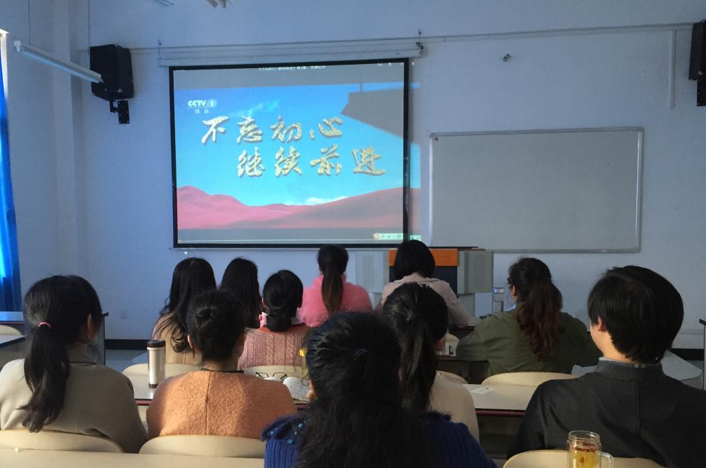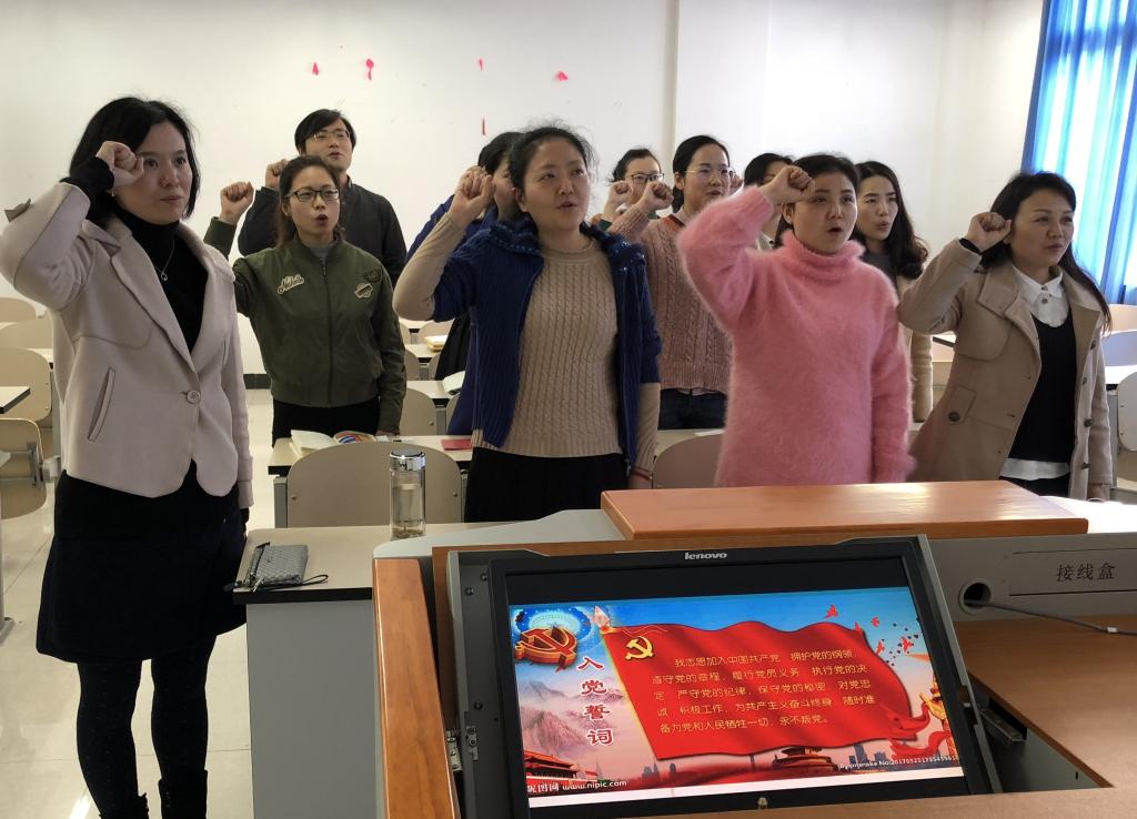 会上,全体党员首先在黄琳娜的带领下重温了入党誓词,面对党旗宣誓。紧接着大家在支部委员耿文俊的带领下系统学习了最新版党章。随后,全体党员观看了 “不忘初心、继续前进”主题教育宣传片,改革开放以来尤其是党的十八大以来全国各族人民在党的领导下取得的社会主义建设的巨大成就深深震撼了在场观看影片的党员同志,大家纷纷表示要不忘初心,牢记使命,践行社会主义核心价值观,坚持立德树人,做好学生的教书育人工作,为新时代中国特色社会主义培养合格的建设者和接班人。