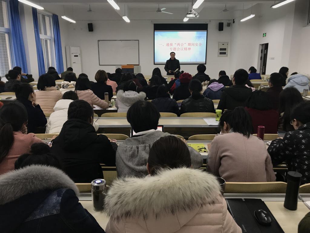 院长苏启立传达了学校“两会”期间安全稳定专题工作会议精神,要求全体老师要提高政治站位,坚持底线思维,切实做好“两会”期间安全稳定工作,加强矛盾纠纷排查,关注校园网络安全,推进扫黑除恶专项斗争,加强学生心里疏导,防范意外伤亡,做好校园交通安全以及食品安全和卫生防疫工作等。