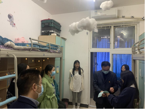 2021年11月17日,财经管理学院党总支书记苏启立、副院长张建、副书记阳春艳带领全体专兼职辅导员深入寝室,开展寝室安全隐患排查,进行反诈宣传。