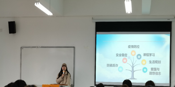 在主题班会课上,辅导员结合学生实际从爱国教育、疫情防控、课程安排、防骗反诈、消费习惯、心理调节等方面进行讲解与案例剖析。此次主题班会活动的开展,引导同学们在疫情当下的行为习惯,树立信心,加强班级凝聚力等。钟子文老师在会上重点强调了安全问题,包括用电安全、交通安全、疫情防控安全、财产安全等,特别提醒同学们开学季反电信诈骗问题。薛瑾老师围绕疫情防控、乡村振兴、党建精神、北京冬奥等时事热点结合学生实际,教育学生坚定理想信念、涵养家国情怀、坚定“四个自信”,砥砺奋斗精神,树立正确的世界观、人生观、价值观。郭佳老师针对疫情防控、校园安全、新学期计划等方面对学生进行指导教育,对学生们提出新希望、新要求、新建议。胥柳老师与同学们分享冬奥会的成功举办和女足亚洲杯决赛中夺冠后的感受,强调当代大学生要提升爱国意识、坚定理想信念,学习发扬奥运精神,给同学们留下了深刻地印象。
