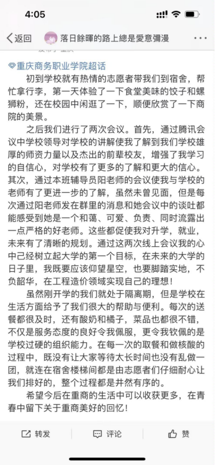 苏教授首先代表学院热烈欢迎2022级财经管理学院全体新生。并以“新商院、新时代、新征程”为主题,详细介绍了重庆商务职业学院的前世今生,深入剖析了院徽的寓意、解读了“立本、明理、融合、尚行”的涵义,通报了学院近几年的发展历程和取得的成效,提出了对标抗疫逆行先锋,山火救援先进,号召全体新生立足新起点,争当安全先锋、争做文明学子。课程中,结合院徽的设计理念,同学们线上积极的提问和连线互动,把课堂的氛围推向了高潮。最后,苏教授希望全体新生,立足新时代,担当新作为,在青春的赛道上跑出好成绩,为成为德智体美劳全面发展的社会主义建设者和接班人而努力奋斗。