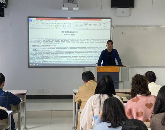 【图/文 顾志飞】3月17日下午,我院召开专题学习会议,深入学习贯彻《教育部思想政治工作司2021年工作要点》。学院党总支书记、院长邓龙建及全体专兼职教师40余人参加会议。会议由党总支书记、院长邓龙建主持。