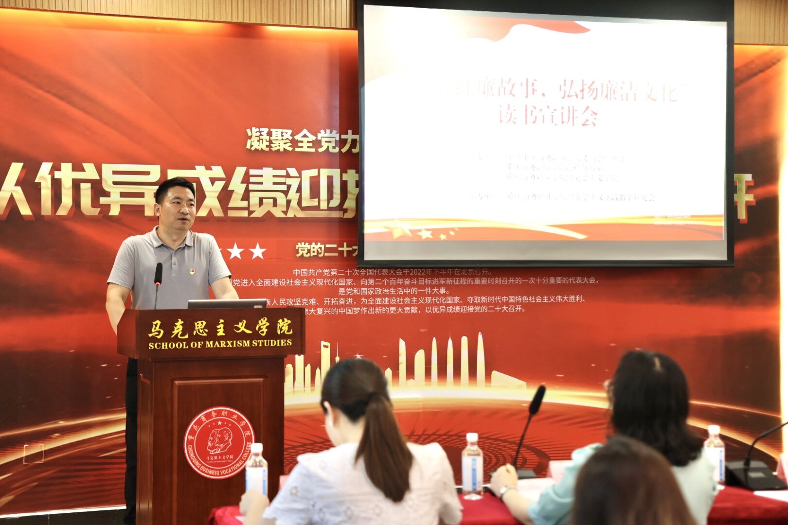 本次活动由中共重庆商务职业学院委员会宣传部、重庆商务职业学院纪检监察室和马克思主义学院联合主办,重庆商务职业学院马克思主义实践教学研究会社团承办,并邀请重庆商务职业学院纪委副书记、纪检监察室主任李蓓英,重庆商务职业学院宣传部副部长杨欣,重庆商务职业学院学生工作部学生事务管理中心主任龙佳梅,重庆商务职业学院团委副书记白净,马克思主义学院党总支书记、院长邓龙建担任评委嘉宾。马院教师代表、马克思主义实践教学研究会社团学生代表参加了活动。