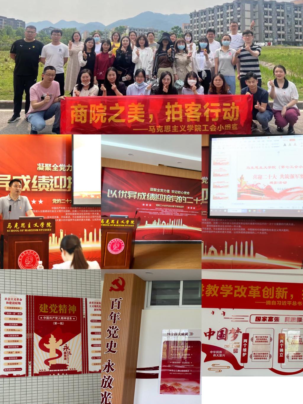 据悉, 2022年上半学年,马院举办了“喜迎二十大、共筑强军梦”“喜迎二十大,健步赏校园”、“喜迎二十大,党的历届代表大会知识竞赛”、“喜迎二十大、讲红廉故事”、“喜迎二十大、大学生讲思政课”、“喜迎二十大、优秀党员讲党课”等系列活动,打造完成了中国共产党精神谱系文化走廊和十九届六中全会党建活动室宣传阵地,为庆祝“七一”,迎接党的二十大胜利召开营造了浓厚的氛围。