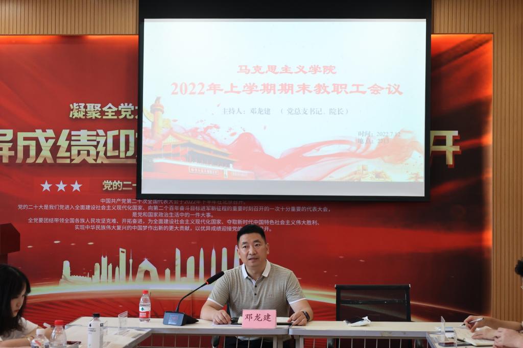 【文/图 顾志飞】为全面梳理总结一学期学院各项工作,研究部署2022学年学院暑期工作,7月12日下午,学院在党建活动室2213召开2022年上学期期末教职工大会。学院领导邓龙建及全院教职工35人参加会议。会议由党总支书记、院长邓龙建主持。