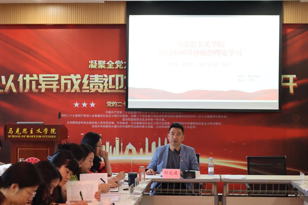 【文/李娅婷 图/顾志飞】10月5日下午,马克思主义学院在2213党建工作室开展了10月份政治理论学习活动。学院33名党员教师参加会议。会议由党总支书记、院长邓龙建同志主持。