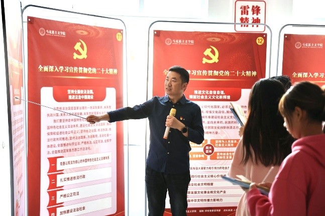【文/图 徐春杰】马克思主义学院近期组织教师精心设计课程内容和教学环节,开展思政实践教学活动。根据课程内容,将课堂“搬”到马院文化长廊,思政教师客串“导游”,将党的二十大精神融入思政课,提升了思政课的凝心铸魂育人目标。用青年学生听得进、听得懂的语言,以更易理解、更好把握的方式诠释了党的二十大报告精神,让党的二十大精神带着热气、灵气、地气进教材、进课堂、进头脑。