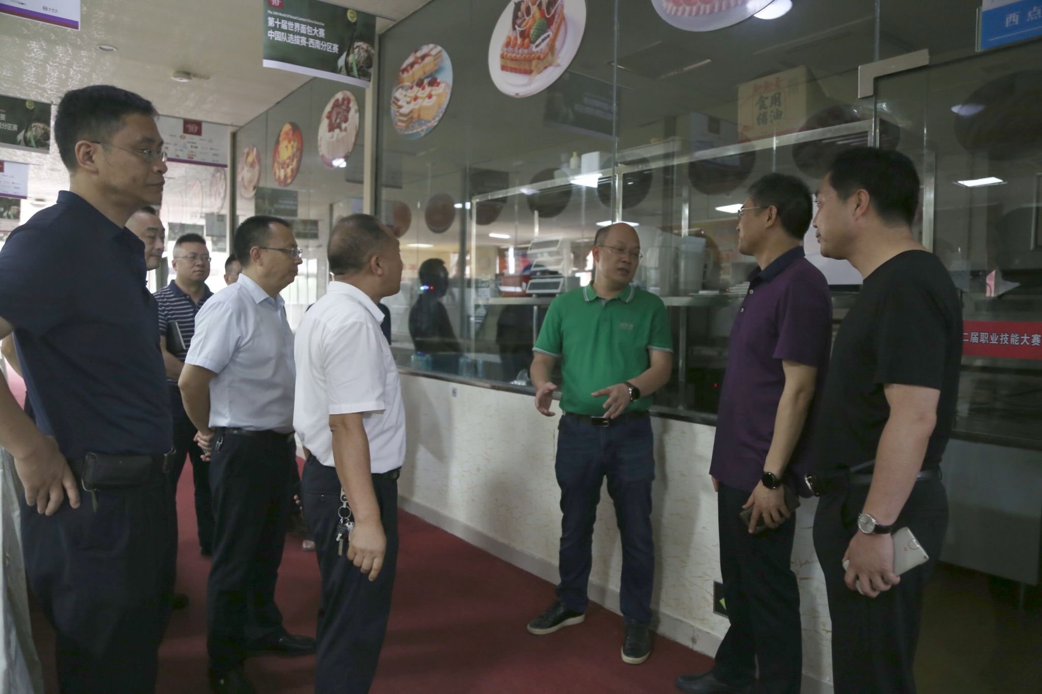 此次调研。江涛、陈忠飞一行现场查看了学生宿舍、烘焙基地、产教融合实训大楼、校园环道、中餐实训室、食堂、西餐实训基地、教学楼等。